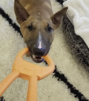 My bull terrier LOVES this toy. Her second favorite game is tug and this is hands down the best tug toy I've ever bought. It's really springy so playing tug doesn't hurt my back and I can play with her longer. She's soooo happy. It's been 8 months and this toy is still going strong. I'm shocked, actually. I also found another great benefit: this toy is perfect for a teething puppy. I adopted a 4 month old bull terrier and he's a chewer. This is his favorite teething toy. The soft rubber is perfect to relieve the teething frustration without damaging the baby teeth. And he can't do any damage the toy, either. We have several sodapup toys, but this one in particular is shaped perfect for teething chewing.