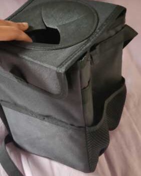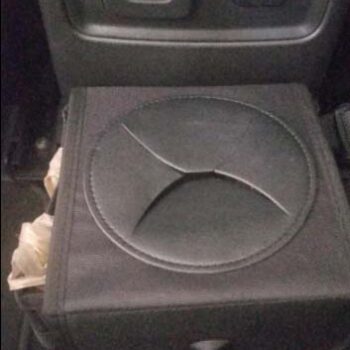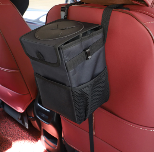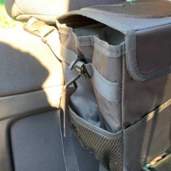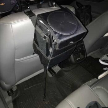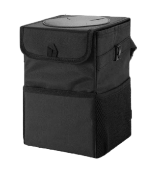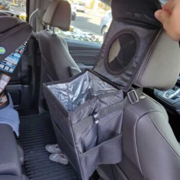 This trashcan works well in our SUV. With three kids and a busy schedule we often eat snacks or food in the car. This is the third trashcan I’ve now bought for a vehicle, and this one they got it right. The size is good and holds quite a bit. The thing I like the most is the top you don’t actually have to undo it or do anything to access the trash can you just push it in the top. My kids broke the last one by stepping on it too many times, and this one actually is elevated off the ground which makes less of a tripping hazard. You can also put a trash liner it so you can just take out the whole bag of trash out quickly and easily. It also had like a bungee cord on it if you didn’t want to use the strap if you wanted to utilize it somewhere else. I put it around my center console so it could be utilized in the backseat.