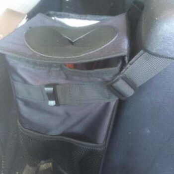 This is a well constructed and sturdy trash bag. The 2 features that I like best are the multiple straps so you have a few different ways to secure it and that it has clips to secure a plastic grocery bag inside for easier clean up. The velcro top with the unique opening allows you to easily place things inside one-handed, but keeps them well contained and out of sight.